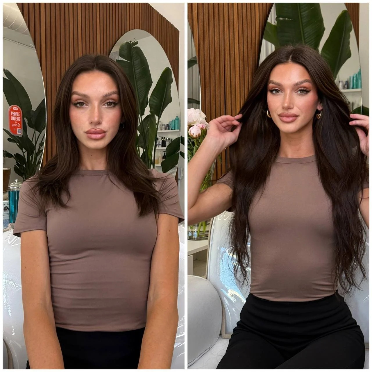 Medium volume keratin bond hair extensions with added length — natural brunette transformation Los Angeles